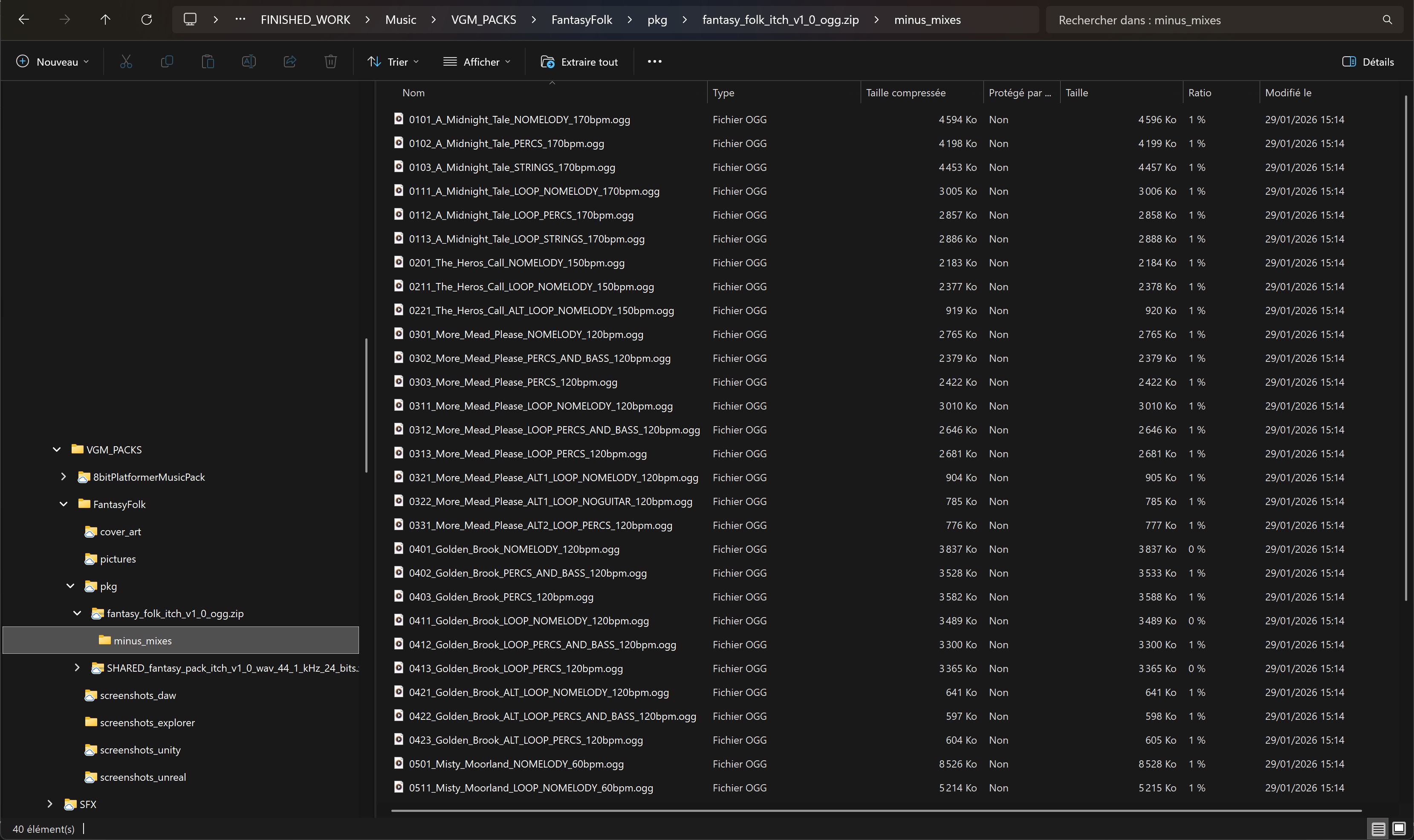 As mentioned above, a minus mix is a version of a track in which one or several instruments were removed. For instance, most tracks also have a "no melody" version, or a "percussions only" version. This is meant to provide with more options and variety when implementing my music in your game. If you'd like different minus mixes or layers, or if you'd like help implementing them in your game, feel free to contact me directly (corentin.guezenoc.contact@gmail.com).